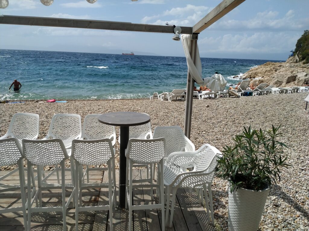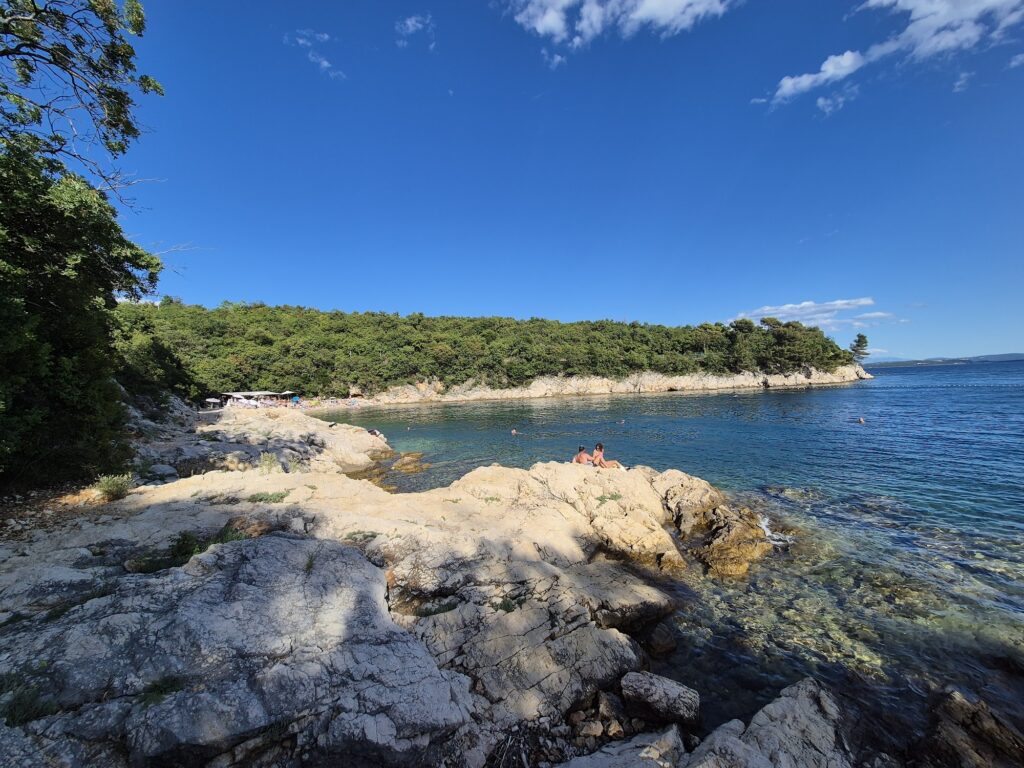A beach bar positioned just above the shoreline provides coffee, cold drinks, and light refreshments throughout the day. It is a simple amenity, but its position — looking directly out across the water toward Cres and Krk — gives it a quality that has nothing to do with the menu. On the morning of my first visit, I sat there for the better part of an hour with an espresso, watching the light move across the bay, and it ranks among the more quietly satisfying half-hours I have spent anywhere on this coast.