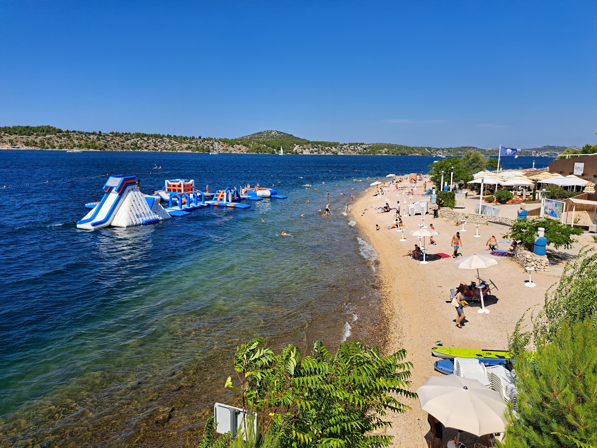 The range of activities available alongside the swimming — volleyball, basketball, the workout park — gives older children and teenagers something active and engaging to pursue that does not require them to simply continue swimming indefinitely. The short walk to the old town opens up the possibility of combining a beach morning with an afternoon exploring the cathedral and the fortress, which provides a genuinely educational dimension to a family day that most beach destinations cannot offer. Family beaches in Šibenik are not numerous, and none of them offer the combination of facilities, safety, proximity, and cultural context that Banj provides.