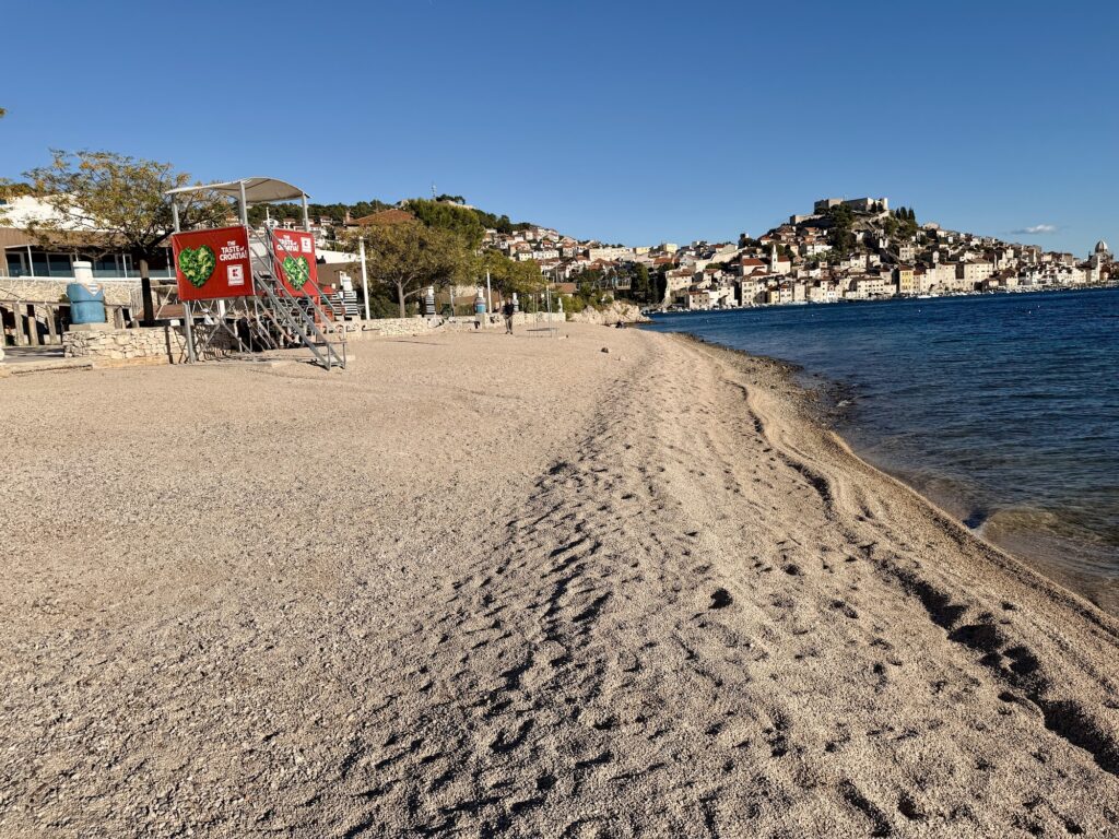 Most beaches ask you to leave the city behind. Banj Beach in Šibenik asks you to bring it with you — and what it places in front of you in return is one of the most extraordinary urban views in the Mediterranean. Lying on the pebbles at Banj, looking across the water at the honey-coloured stone of St. James Cathedral and the fortresses that crown the hillside above the old town, you become acutely aware that you are swimming in a place where the sea and several centuries of Dalmatian history occupy the same field of vision simultaneously. It is an experience unlike any other beach I have visited in Croatia, and it has stayed with me in a way that is difficult to attribute to the water or the facilities alone.