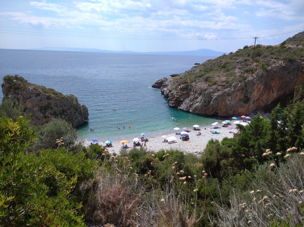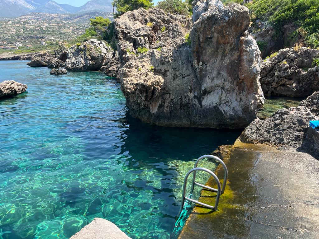 Gnospi is a “hidden gem” swimming spot located just a short walk from the village of Agios Nikolaos in the Mani region. It is not a traditional sandy beach, but rather a picturesque rocky cove that offers a unique and more adventurous swimming experience.