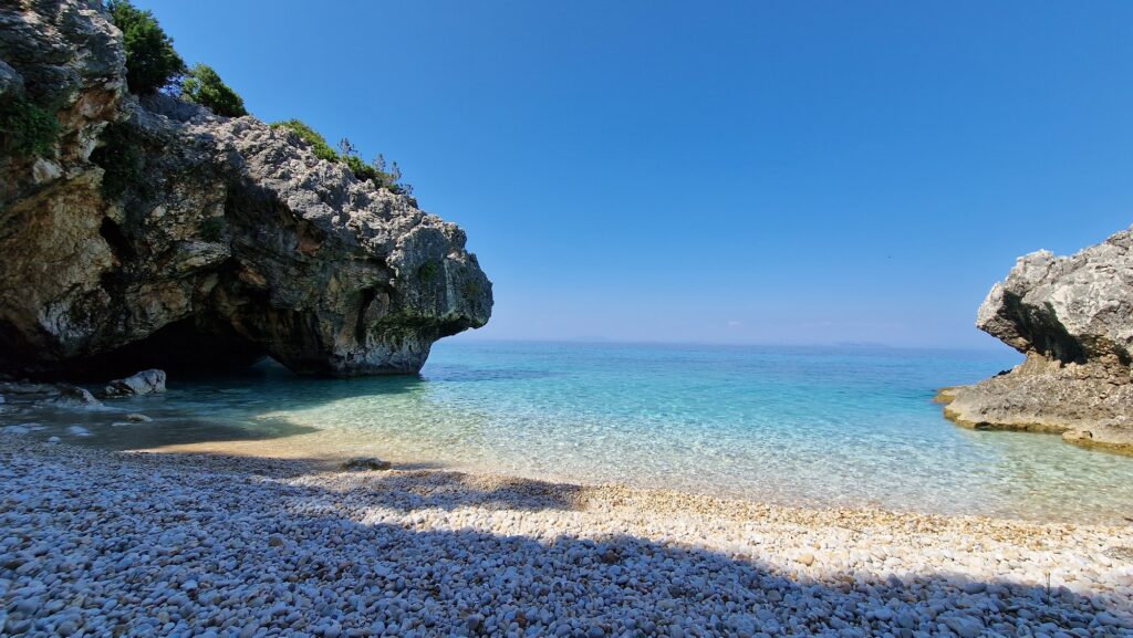- Pebbly Surface: The shore is made of smooth beige/white pebbles. Because the pebbles continue into the sea floor, almost all reviewers strongly recommend wearing water shoes (aqua socks).