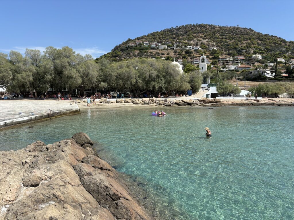 - Rugged Surroundings: The beach is set in a rugged, rocky landscape that offers nice views of the Saronic Gulf and nearby islets. The shoreline itself is primarily sandy but features pebbles and rocks as you enter the water.