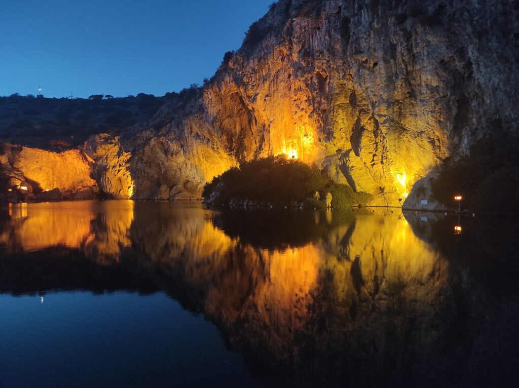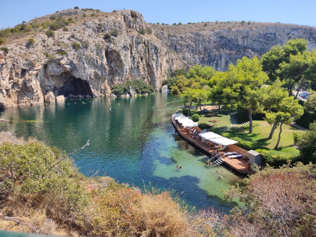 Vouliagmeni Lake is a world-renowned natural thermal spa located on the Athens Riviera. It is celebrated for its therapeutic brackish waters, unique geological formation, and “doctor fish” experience.