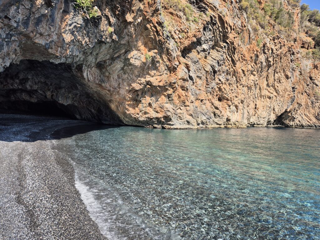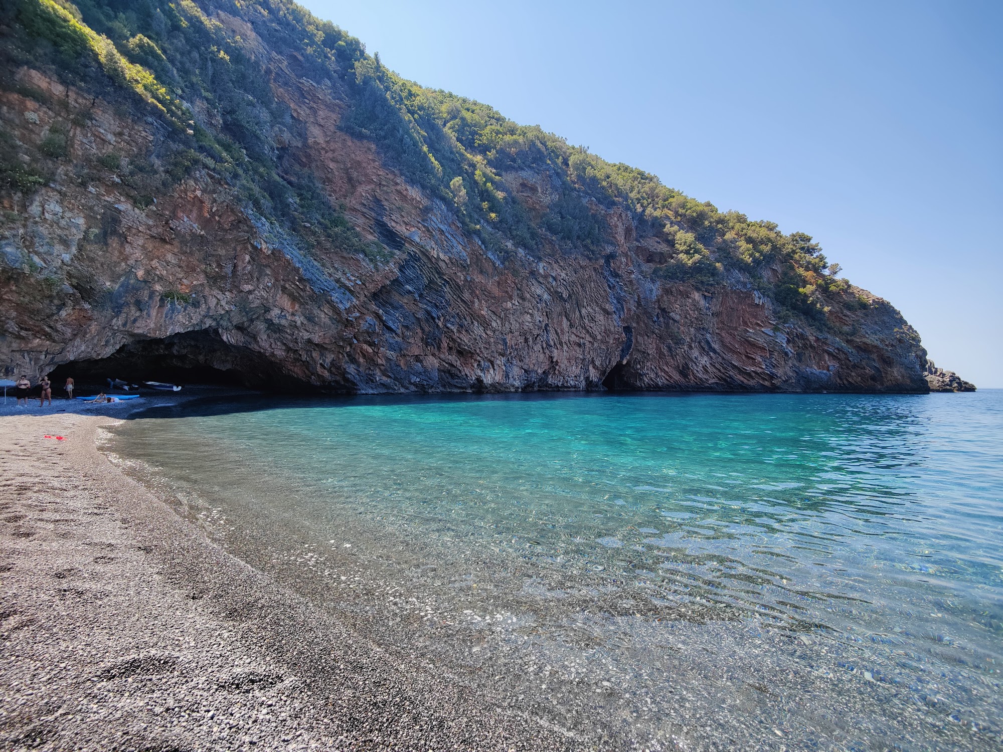 - Dramatic Scenery: The beach is set against a backdrop of steep cliffs and lush vegetation. A unique highlight often mentioned is a sea cave with stalactites located in one of the corners of the bay.