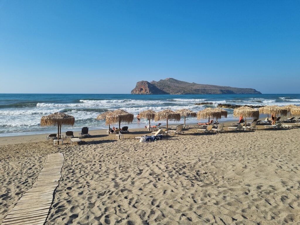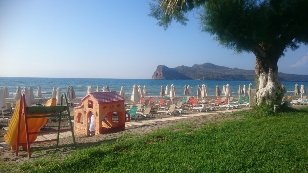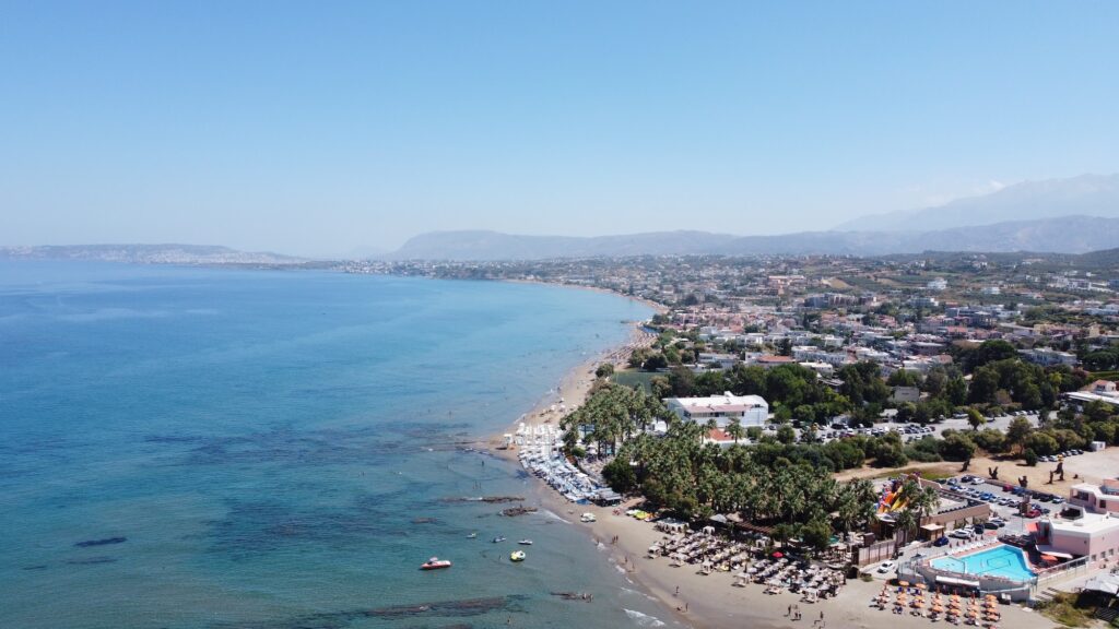 Agia Marina Beach near Chania is one of Crete’s most popular and well-organized coastal destinations, highly regarded for its long sandy stretch and vibrant atmosphere.