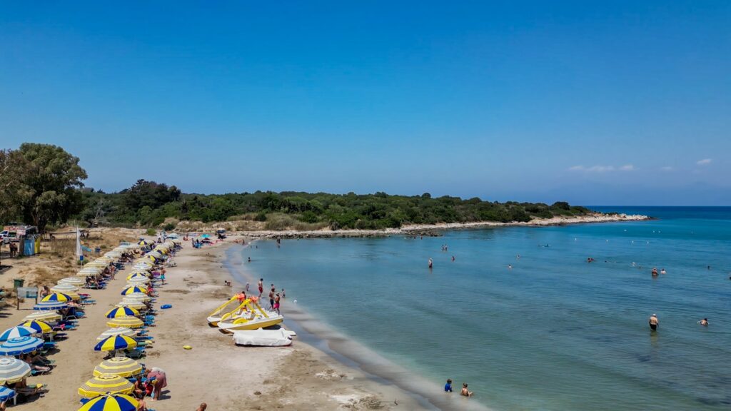 - The beach is fully organized with sunbeds and umbrellas for rent, showers, and proximity to numerous tavernas and supermarkets. It is particularly popular for renting pedalos, kayaks, or joining boat tours to explore nearby sea caves and hidden coves.