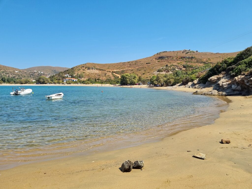 Paralia Fellos (Fellos Beach) on the northwestern side of Andros is a highly-rated, tranquil destination known for its natural beauty and family-friendly atmosphere. Located just 4 km from the port of Gavrio, it is considered one of the most accessible and relaxing beaches on the island.