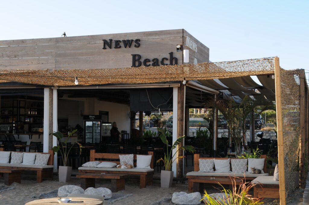News Cafe Beach in Karteros is a popular and vibrant beach club that offers a mix of relaxation, plane-spotting, and high-quality service. It is often described by visitors as a “paradise close to the city” of Heraklion.