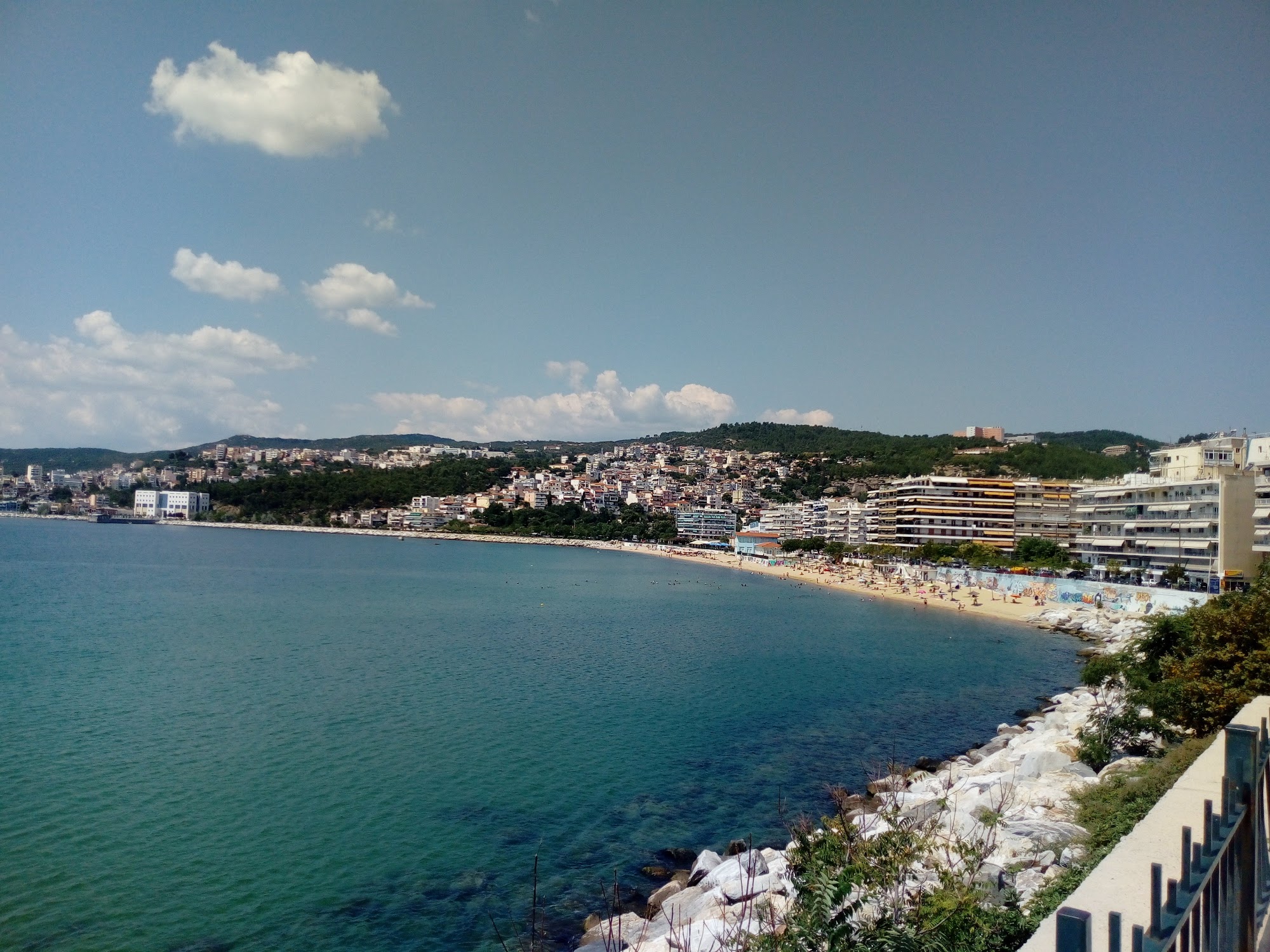 Rapsani Beach is a well-regarded urban beach located in the heart of Kavala, offering a convenient seaside escape for those who want to stay close to the city center. This Blue Flag-awarded public beach is widely praised by visitors for its cleanliness and organized facilities, providing an “easy solution” for a quick dip or a relaxed day by the Aegean Sea.