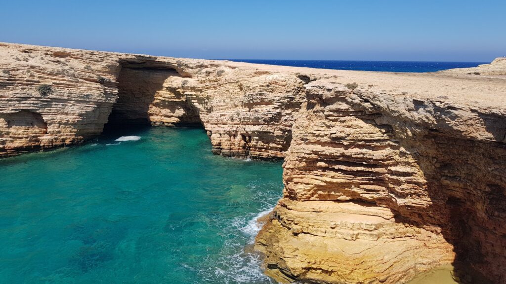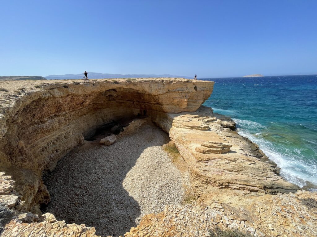 Gala Beach in Koufonisia is a unique geological marvel often described as one of the most exotic and hidden gems of the Cyclades. Its name, which means “milk” in Greek, comes from the frothy, milky-white appearance the water takes as it rushes through a sea cave into the enclosed pebble area.