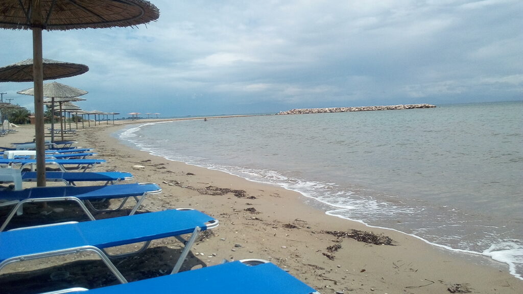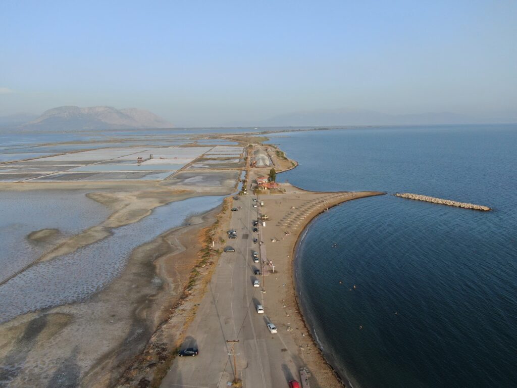 Tourlida Beach (Τουρλίδα) is a very unique coastal spot that differs significantly from your typical sandy Greek shore. Located at the end of a long, 5km causeway that cuts through the Messolonghi Lagoon, it offers a “floating” experience between the calm lagoon waters and the open sea.