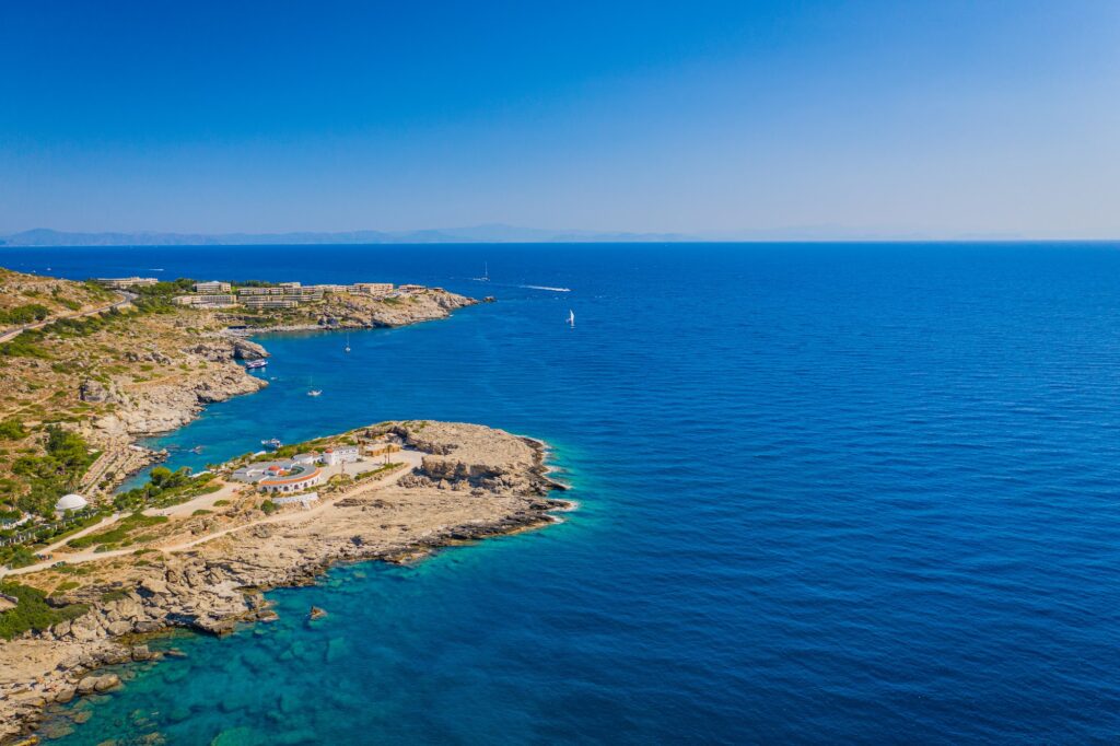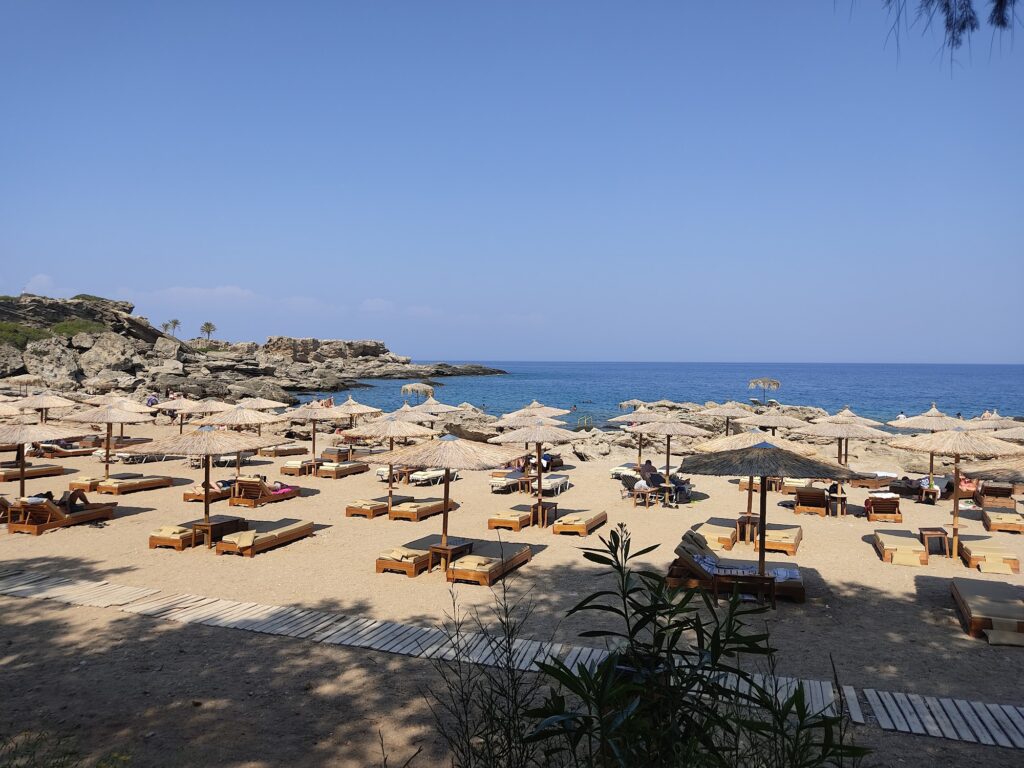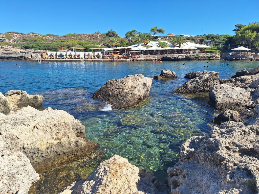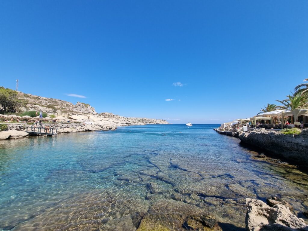 - Tranquil & Picturesque: Reviewers frequently describe the beach as a “tranquil and scenic destination.” Surrounded by pine trees, sculpted rocks, and small creeks, it offers a more intimate and peaceful atmosphere compared to the nearby, lively resort of Faliraki.