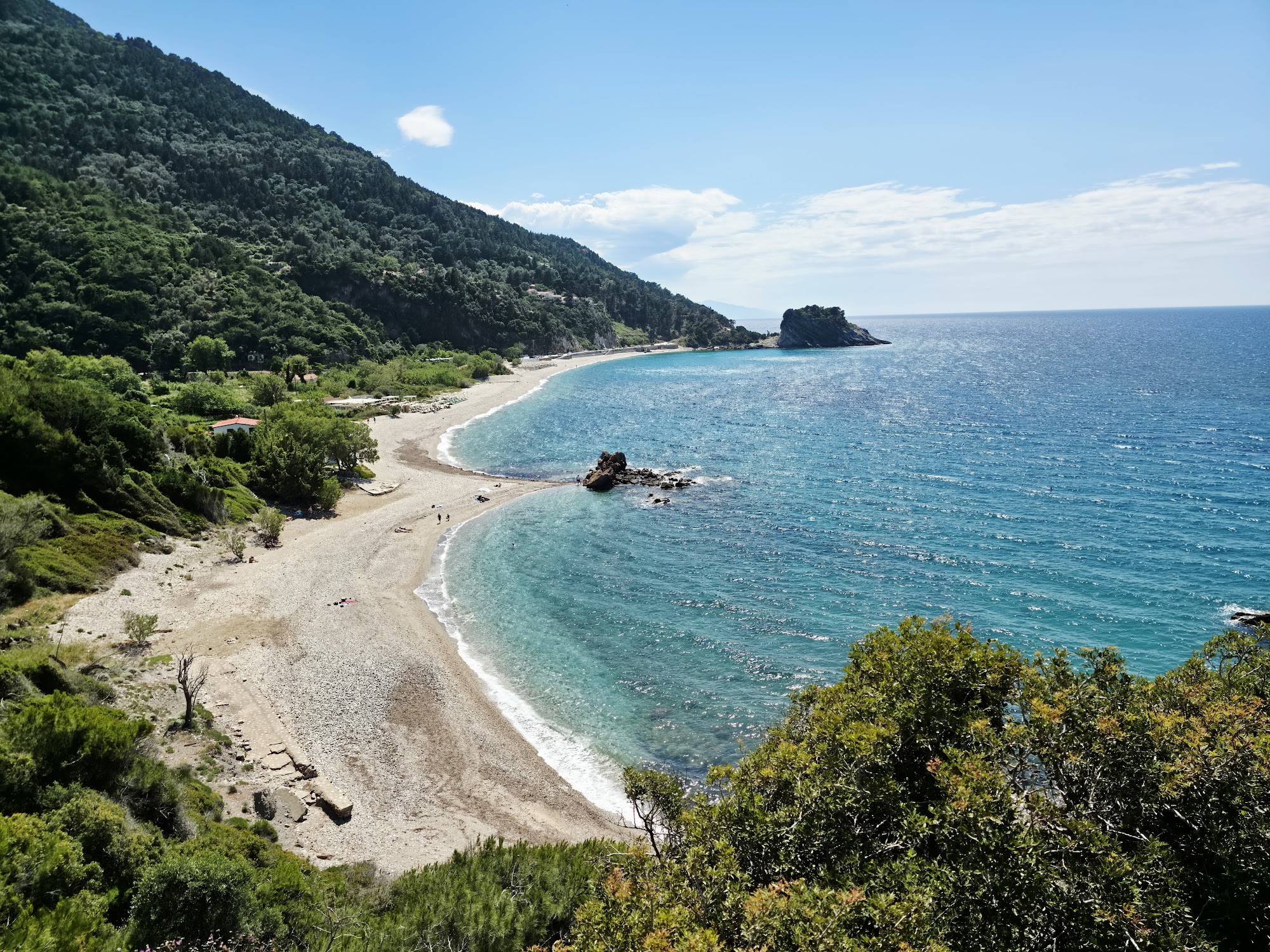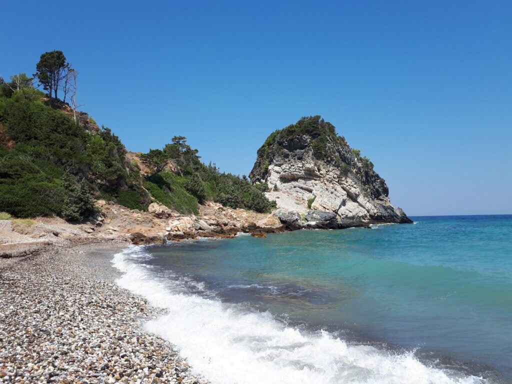The Famous Horseshoe Curve: From the road above, the beach forms a perfect, cinematic arc. The white pebbles on the shore create a startling contrast against the deep teal of the water, which stays exceptionally clear even when the North Aegean breezes pick up.