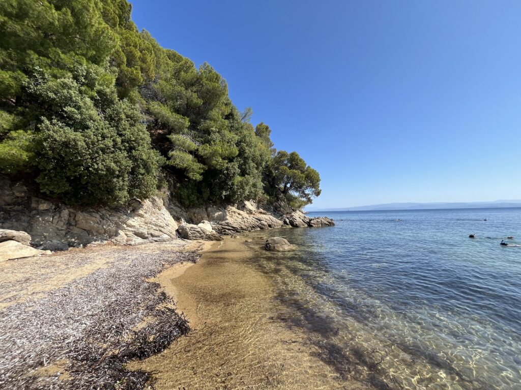 The shore at Maratha Beach is a stunning stretch of fine, silk-like golden sand, characteristic of the best beaches in the Northern Sporades. The beach is relatively narrow, which creates a cozy, exclusive feel, almost as if you have discovered a private club in the heart of nature. Tall, ancient pine trees lean over the golden shore, reflecting a deep emerald hue onto the water’s surface.
