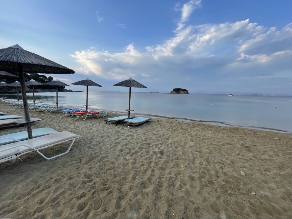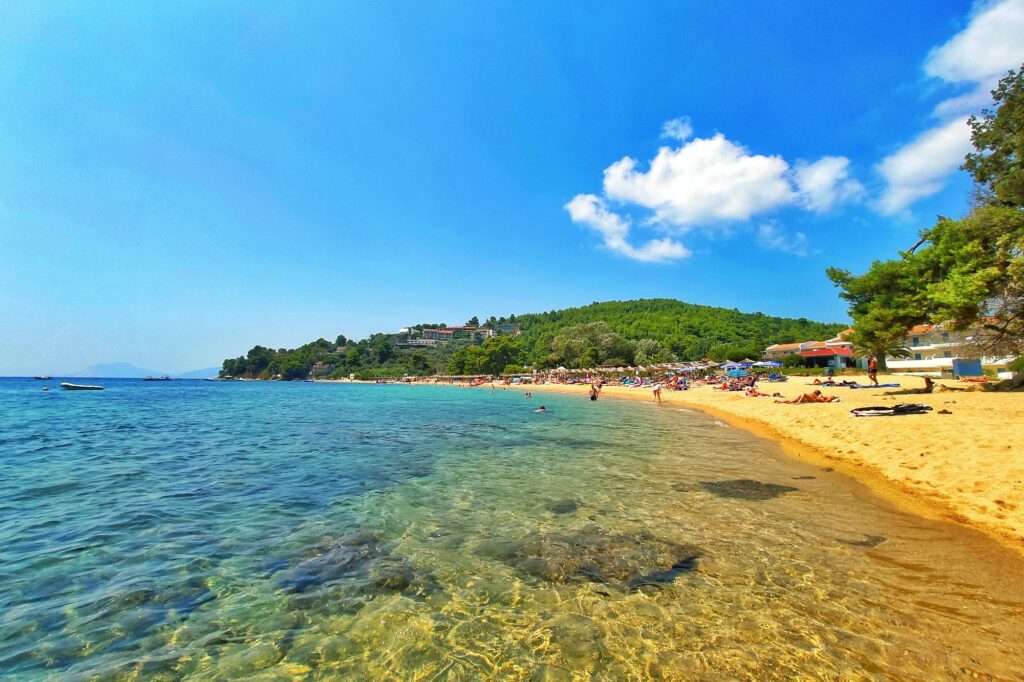 If you are searching for the quintessential Skiathos beach experience—where the sand is golden, the water is shallow, and the scenery is framed by lush Mediterranean greenery—look no further than Paralia Troullos. Named after the small, dome-shaped islet that sits just offshore (resembling a “troullos” or church dome), this beach is a masterclass in Aegean beauty.