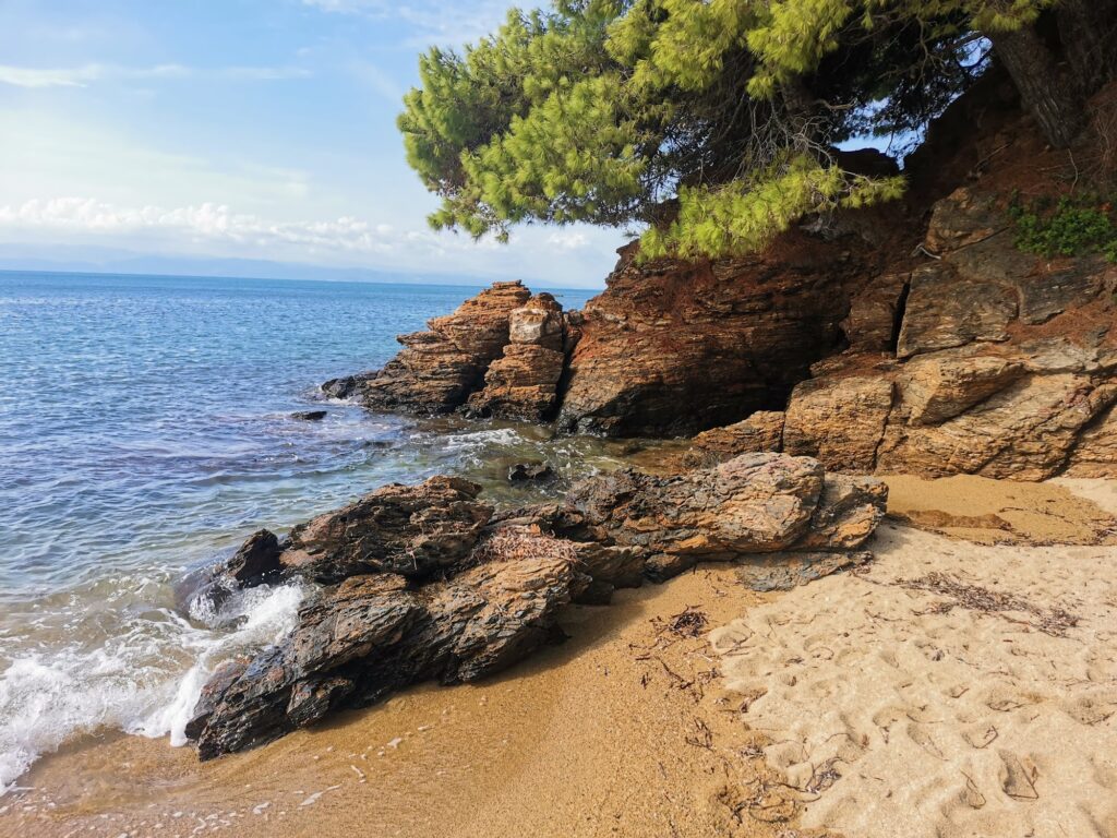Paralia Troullos is famous for its “emerald” appearance. The dense pine forests of Skiathos grow right down to the edge of the sand, reflecting in the crystal-clear water and giving the bay a vibrant, life-affirming hue.