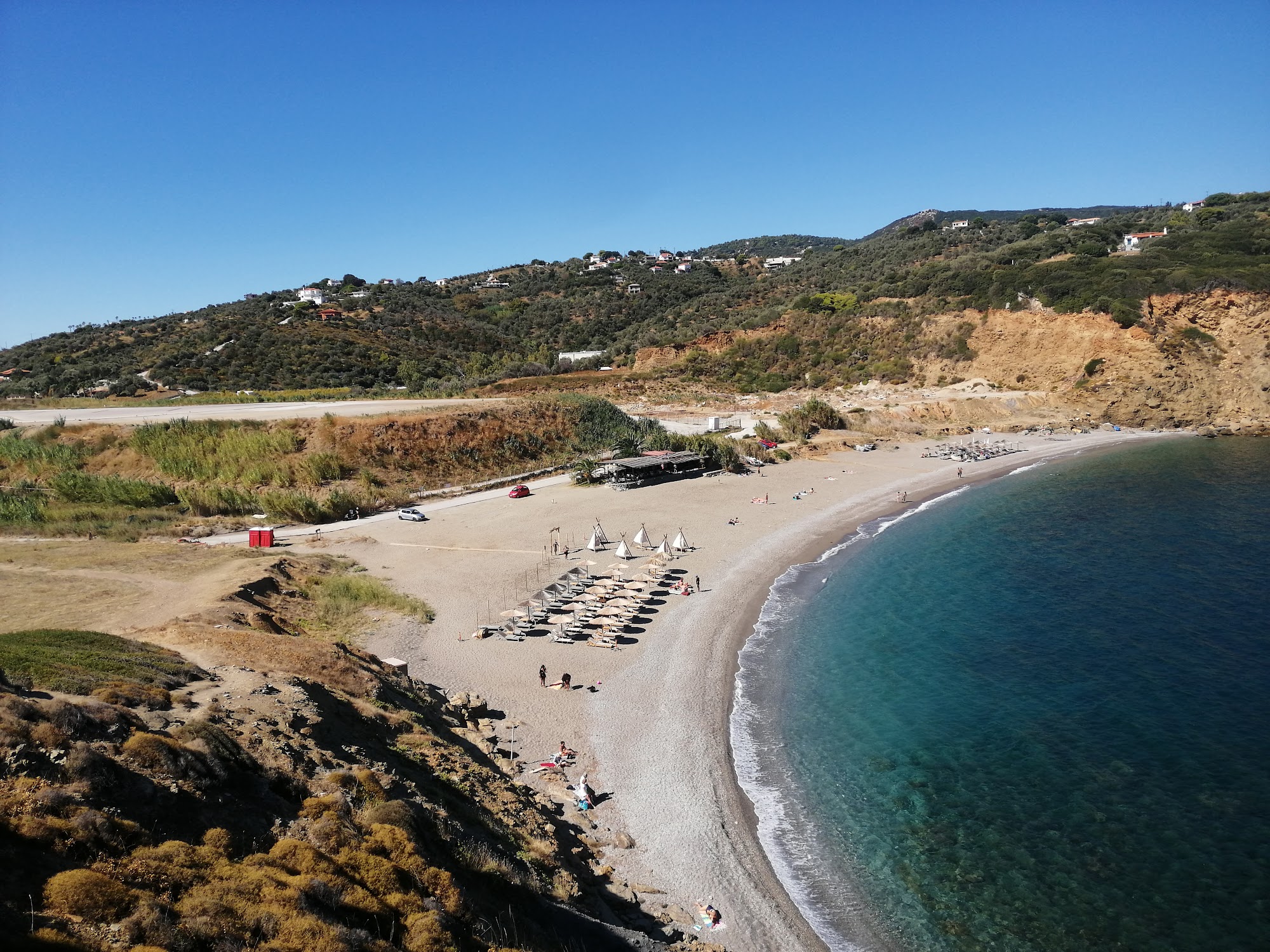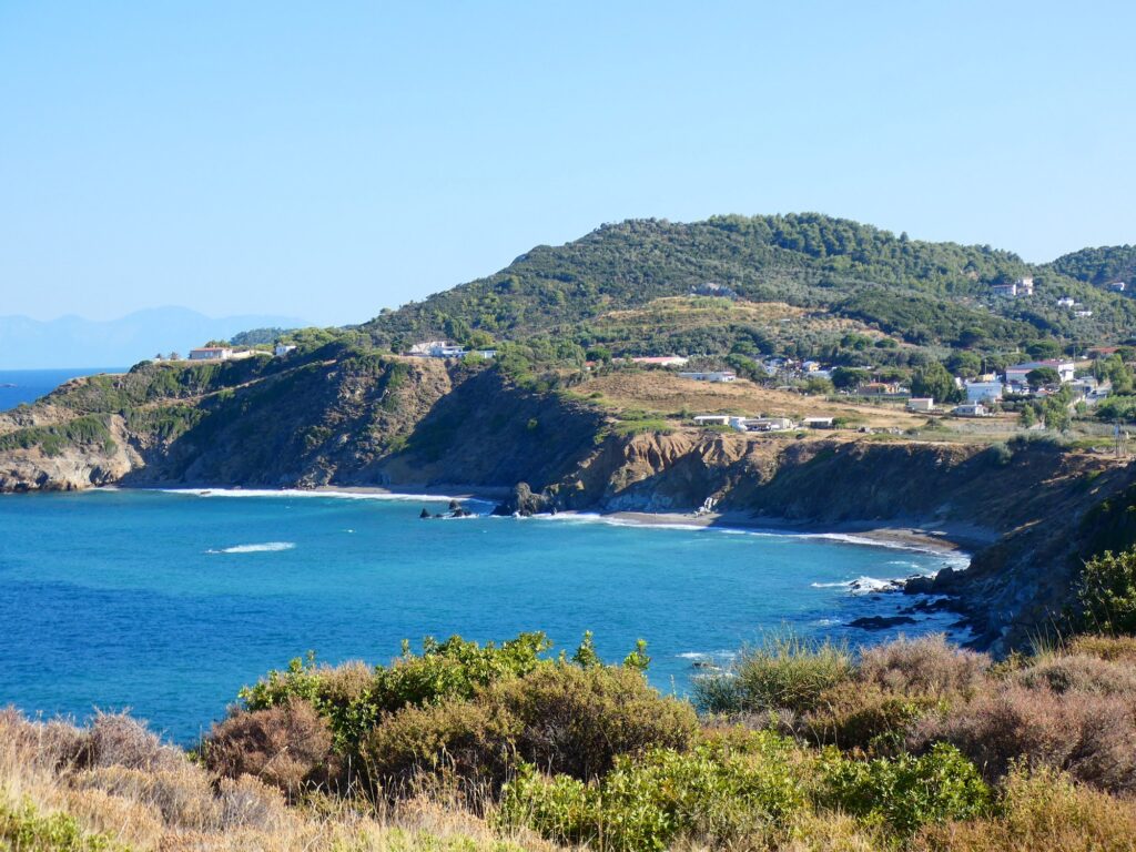 The shore at Xanemos Beach is a striking expanse of coarse sand and smooth, dark pebbles, which give the coastline a rugged and authentic character. Unlike the shallow, sandy coves of the south, Xanemos is open to the North Aegean, meaning the landscape is constantly refreshed by the sea.