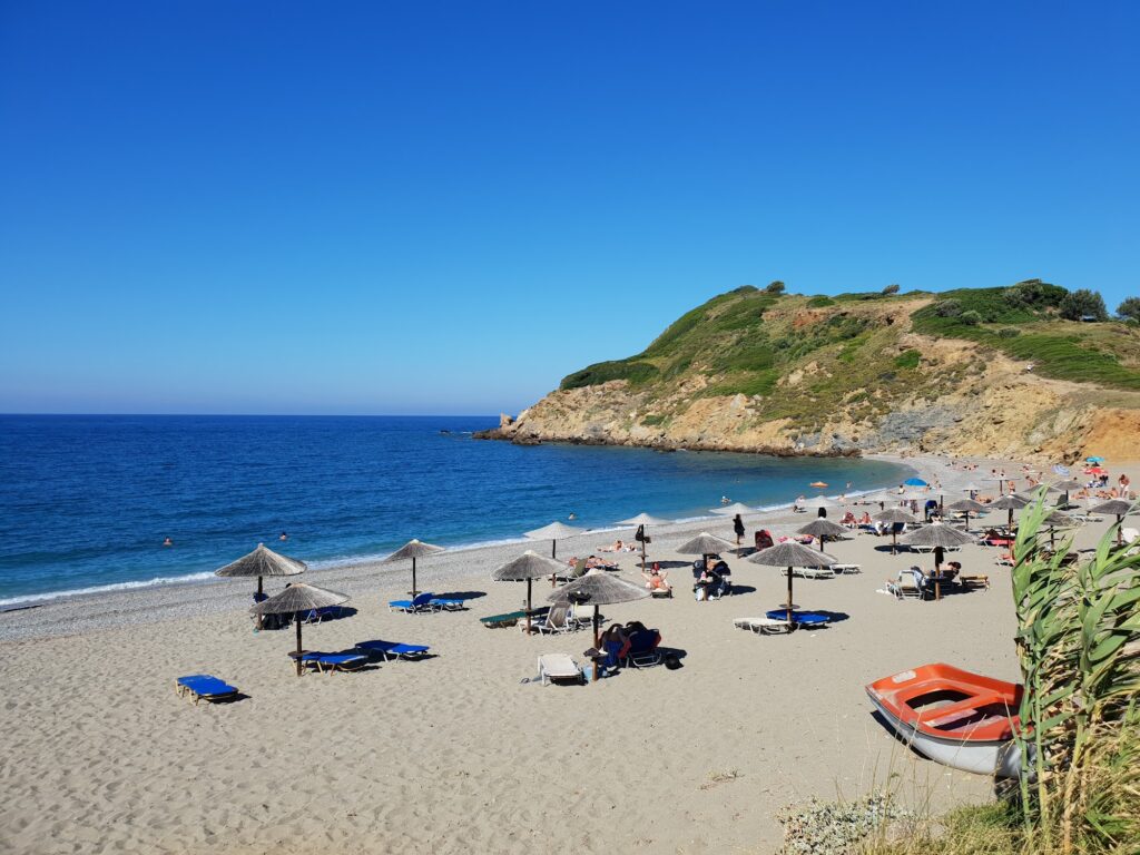 The water quality is exceptional, consistently characterized by its “mirror-like” clarity and invigoratingly fresh temperature. Because the beach faces the open sea, the water is crystal-clear, making it a premier spot for independent snorkeling along the rocky outcrops. On days when the northern winds (meltemia) blow, the bay produces impressive, rolling waves that are a joy to watch and provide a refreshing challenge for strong swimmers. The seabed deepens somewhat steadily, revealing a pristine underwater world that reflects the wild beauty of the island.