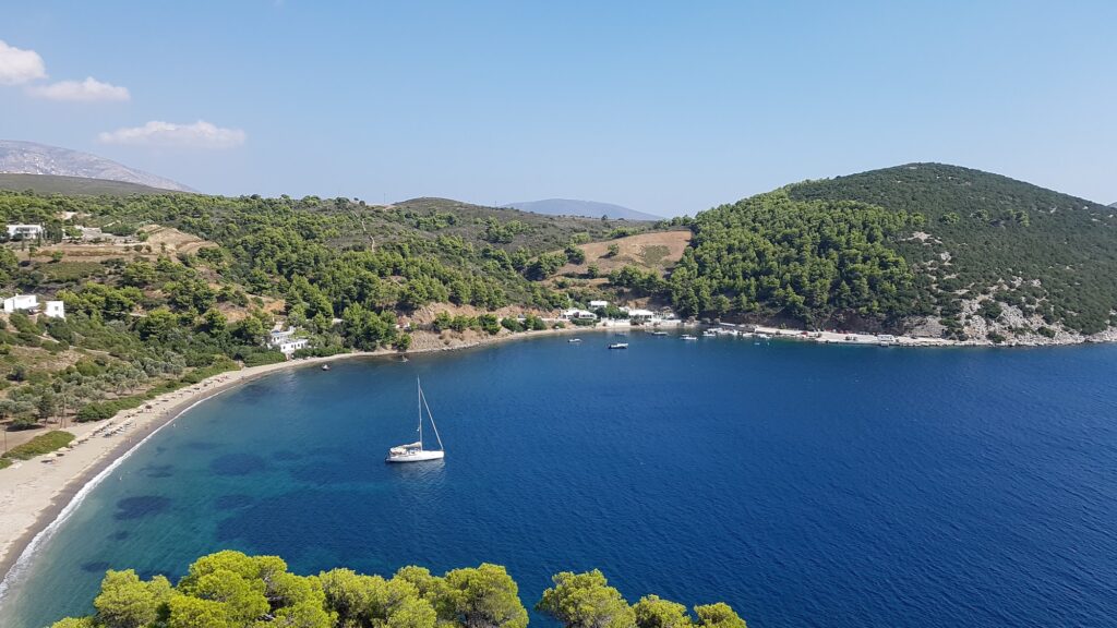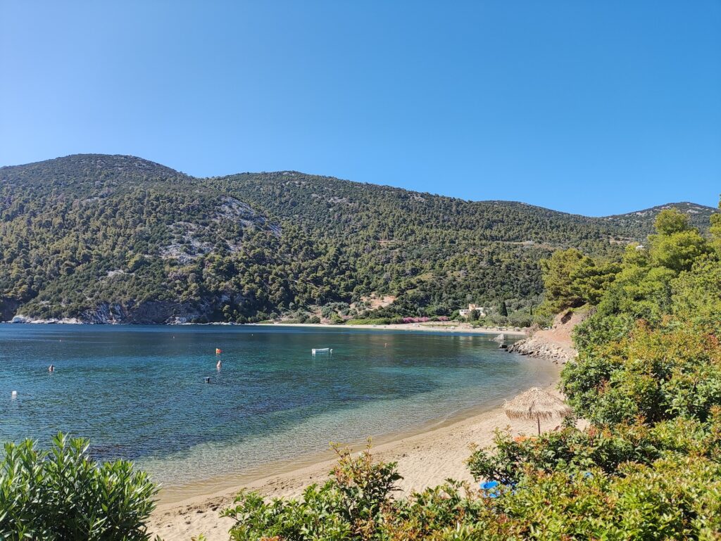 - Serene and Picturesque: Reviewers describe Pefkos as a “hidden paradise” and one of the most breathtaking destinations on Skyros. The beach is nestled in a beautiful bay surrounded by lush pine trees (pefko means pine in Greek) that reach almost to the water’s edge.
