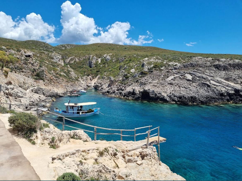 Porto Steniti Beach on the west coast of Zakynthos is a secluded, fjord-like bay known for its rugged beauty and